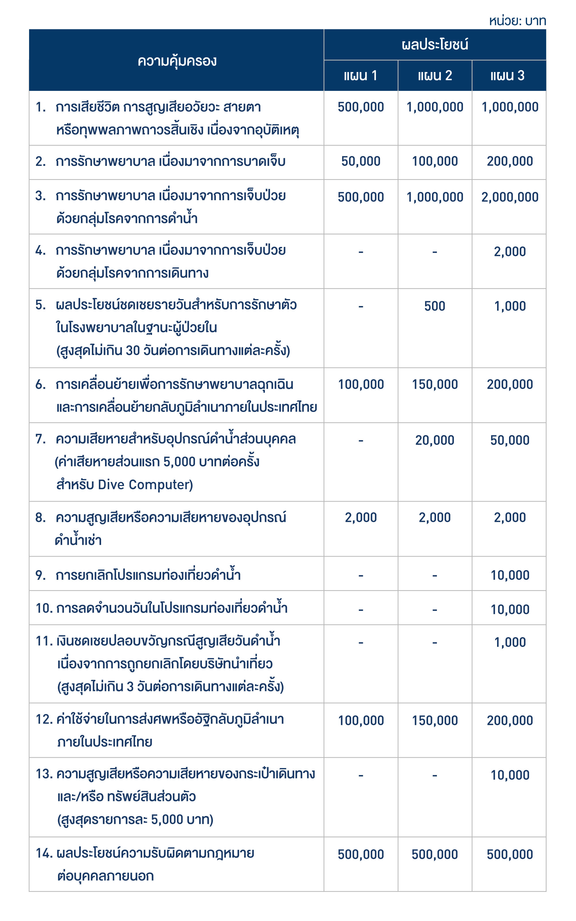 ครอบคลุม ค่ารักษาพยาบาลการเจ็บป่วยด้วยกลุ่มโรคจากการดำน้ำ และกลุ่มโรคจากการเดินทาง